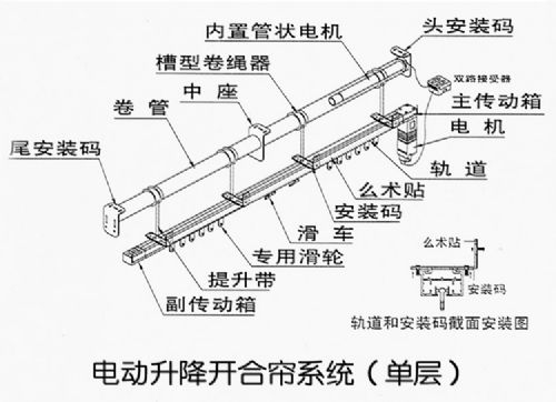 1、本产品以一套升降机构,悬挂单套/两套开合机构,可挂开合式的一层布和一层纱,实现开合帘左右开合,同事可以将开合帘从高出下降到任意位置。