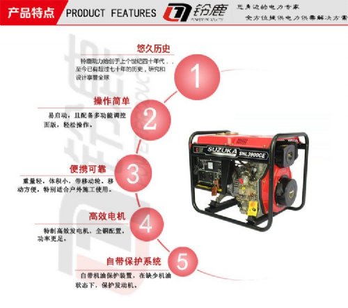 1.动力系统采用铃鹿(SUZUKA)原装动力,低噪音,低油耗,高稳定性.发电时不抖动移位。
