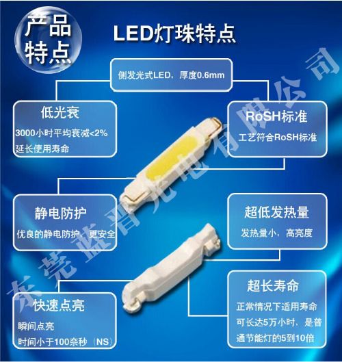 主营业务:LED贴片,全彩LED,三色LED灯,侧发光LED,双色LED,背光LED,超长脚LED等系列产品