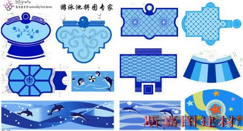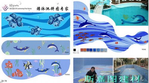 色彩绚丽的马赛克装饰着整个泳池,专业设计师设计各种不同图案拼贴而成。在水中,整体效果达到极致,栩栩如生。泳池底部全是马赛克铺成,拼出了几只色彩各异的多色海豚图案,海鱼和海草真是美轮美奂。使进入泳池仿佛进入了海底世界。 - 佛山市斯嘉图建材有限公司