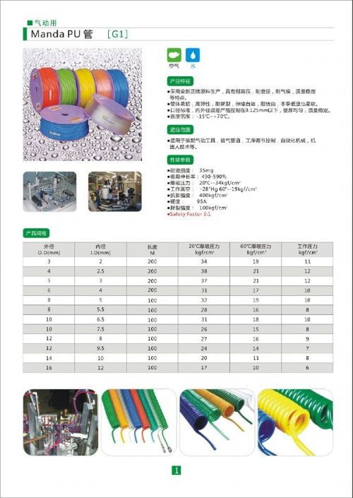采用全新正牌PU料加工而成.具有耐高压、耐磨损、耐气候、质量稳定等特点,管体柔韧,高弹性,耐撕裂、伸缩自如、耐绕曲、冬季低温也柔软。口径标准、内外径误差严格控制在0.125mm以下,壁厚均匀、质量稳定。