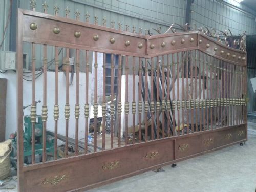 本锌钢铁艺大门,单扇宽度:5.2M*2.85M,双扇合计:11.4M*2.85M,创下铁艺类双开门,少有记录的宽度尺寸规格;本门*大亮点提现在多个方面:1、工艺复杂精湛,装饰花件多而精炼。2、此门表面防锈处理做到*佳精细,磷化防锈处理、喷涂碳黑烤漆、紫铜金粉全手工刷漆、黄铜金粉点缀全手工刷漆。3、此门材料均全为镀锌材料,材料规格厚度1.2-3个不等。4、超负载重量的有力双万象轮。