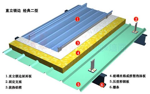 单锁边屋面系统:此系统因肋高有65MM,在面板上完全看不到一个钉子,全包围锁边方式,在排水防水方面相当到位,造形符合铝的特性。外观美观,一般用于体育馆、会展中心、机场、车站等大型标志性建筑。