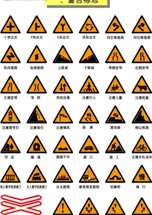 ⑴道路交通警告标志。道路交通警告标志共23种,是警告车辆、行人注意危险地点的标志,其形状为顶角朝上的等边三角形,其颜色为黄底、黑边、黑图案。