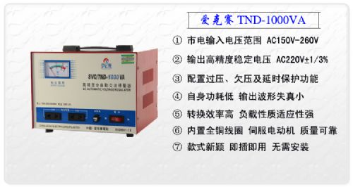 TND/TSD/SVC—系列高精度交流稳压电源具有体积小、波形失真小、稳压精度高、性能可靠等优点。产品分单相、三相两类,有二十几种规格型号。产品广泛应用于需要稳定供电的各种设备。如家用电器、现代办公设备、电教系统、通信网络、监控系统、音响工程、医疗卫生设备、数控加工设备等。是工厂、矿山、科研、医疗等领域所需的一种性能价格比,较为理想的交流稳压设备。