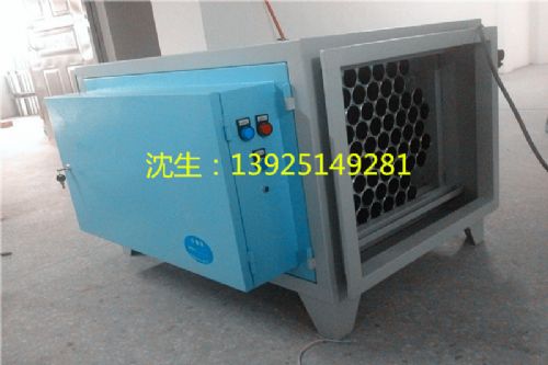 油烟废气由风机吸入高空静电油烟净化设备,其中部分较大的油雾滴、油污颗粒在均流板上由于机械碰撞、阻留而被捕集。当气流进入高压静电场时,在高压电场的作用下,油烟气体电离,油雾荷电,大部分得以降解炭化;少部分微小油粒在吸附电场的电场力及气流作用下向电场的正负极板运动被收集在极板上,并在自身重力的作用下流到集油盘,经排油通道排出,余下的微米级油雾被电场降解成二氧化碳和水,*终排出洁净空气;同时在高压发生器的作用下,电场内的空气产生臭氧,除去了烟气中大部分的油烟气味。