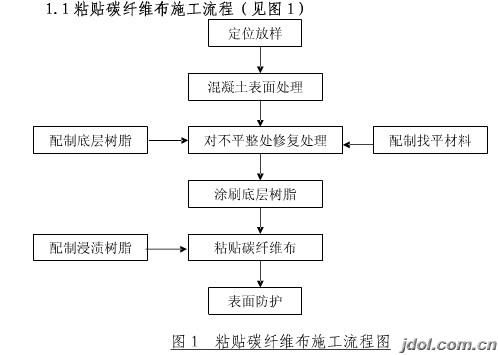 碳纤维加固施工要点: 加固设计→结构表面处理→配制GX-XB修补胶涂刮找平→配制并涂刷GX-TJ底胶→配..