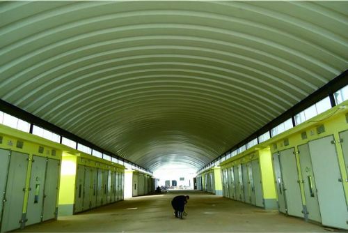 先进的施工方法,科学的设计构思使彩板拱形建筑的整体构造与节点连接合理,精确。一台设备每天可完成彩板拱形屋面工程1000平方米以上。