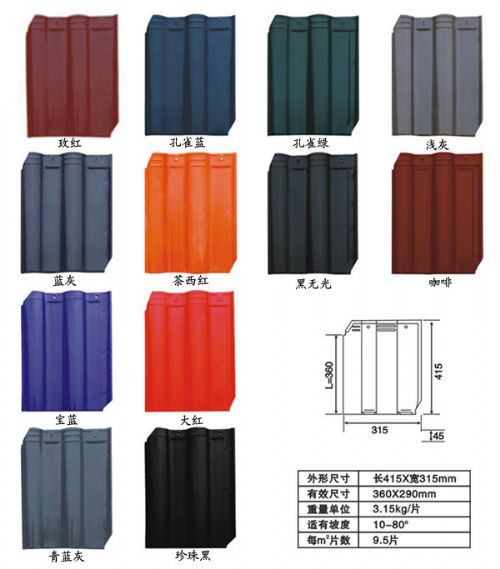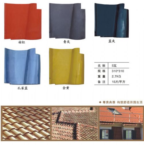 本公司引进国际*的全自动生产流水线,开发生产出多种规格及各种色彩的高级彩釉陶瓷瓦,产品各项技术指标均处国内*水平。这种具有独特防水结构的陶瓷瓦采用1250摄氏度高温烧制而成,从水平屋面到直立屋面都适用,具有强度高、重量轻、平整度好、吸水率低、**腿色、**风化等显著优点。是水泥瓦、传统琉璃瓦更新换代的理想品种,广泛适用于厂房