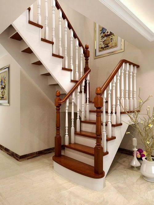 欧式实木楼梯外表干净、简约,具有极强的现代主义装饰风格。白色扶手还具有开阔视野的效果,在视觉上不会占用较..