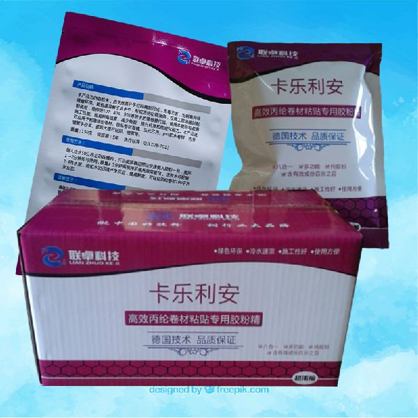 倒入冷水50公斤左右在桶内,开动搅拌器边搅边快速倒入胶粉一包,搅拌1—2分钟即可使用。静置3-5分钟再搅拌后使用效果更佳 该胶水可配制2-4包水泥,能和水泥迅速产生反应,提高粘度。粘贴丙纶卷材100平方米左右。