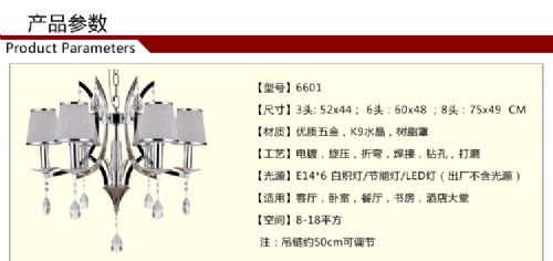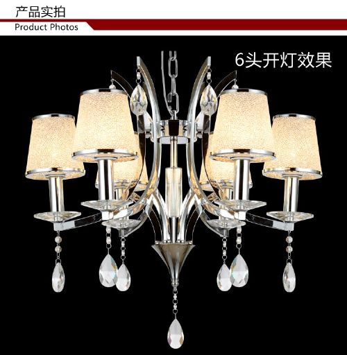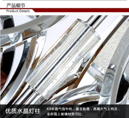 灯具采用优质不锈钢制造而成,表面经过电镀处理,不掉色不退色,外加K9一级透明水晶,高亮不刺眼,高端上档次..