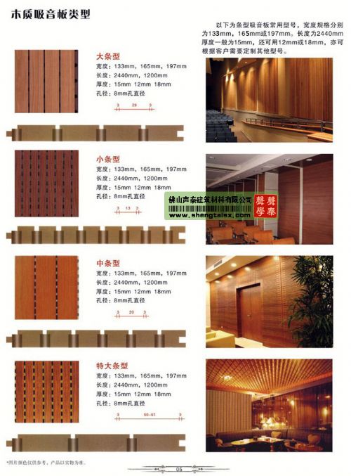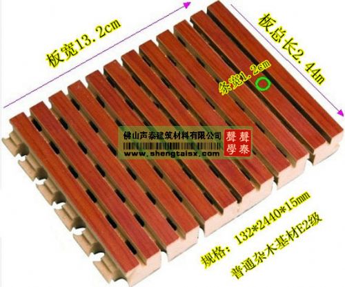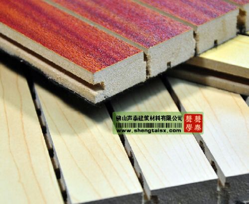 4、槽木吸音板是一种在密度板的正面开槽、背面穿孔的狭缝共振吸声材料。常用于墙面或天花装。