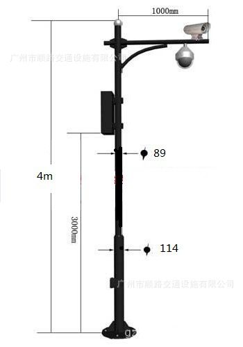 是用于室外监控摄像机安装的柱状支架道路监控通常使用高度6米横臂1米来进行制作。没有特殊情况所有监控杆预埋件混凝土为C25砼,所配钢筋符合国标及受风要求