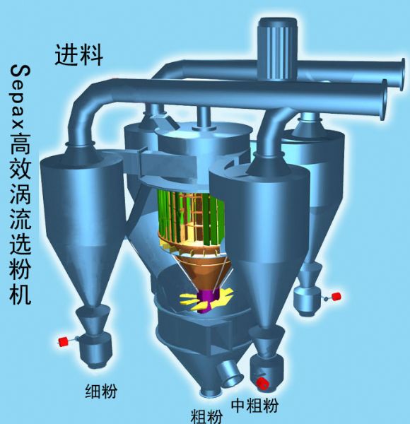 1、将物料“一分为三”,即“粗粉(d>150um)、中粗粉(60um<d<150um)、细粉”。一级选粉分离出混合粉中的粗颗粒,二级精确选粉在导向叶片与垂直型转笼所构成的环形空间完成,因此分级精度特高,分选效率更高。