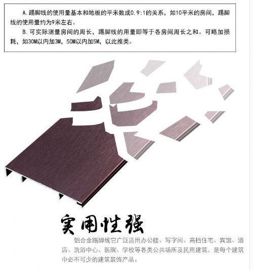 是一种新兴的高档建筑装修材料,这种地脚线是以铝合金型材为原材料,经过严格的技术工艺处理(表面磨砂氧化处理,表面喷涂或表面拉丝氧化处理),特别适合于高级宾馆,酒店,公共场所及高级别墅装饰之用。是新一代环保时尚的装饰精品。使装修效果更理想。