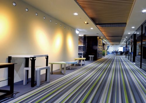 M漫系列采用耐磨丝,颜色鲜艳跳跃感强烈。条纹以满铺为主,纯色片材铺装。