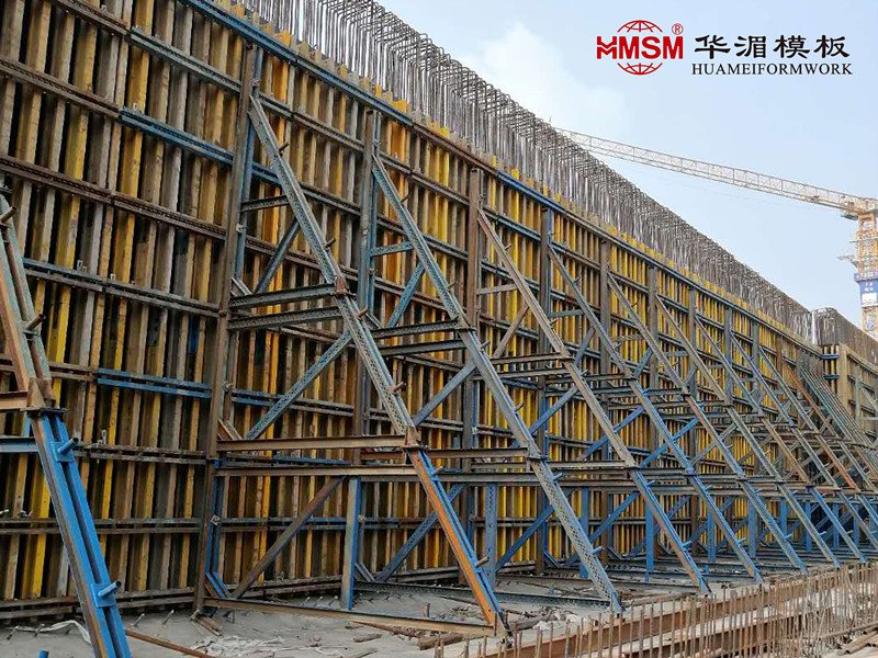 由于施工场地的限制、护坡技术的发展需要,地下室外墙单侧模板支架技术的应用越来越广泛。因无法放置对拉螺栓控制混凝土的侧压力,给模板施工带来了较大不便。许多工程单位采用了多种方法,但跑模、爆模现象时有发生,北京华湄模板专门设计的单侧模板支架,解除了模板加固困难的问题。单侧模板支架设计合理具有施工方便、操作简 单、速度快、受力合理、省工省料等优点。并且在城区内施工操作面小的地下工程是很好的选择。