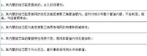 是一种新型管材,它采用高密度聚乙烯和硅胶混合物经复合挤出而成,是一种内壁带有润滑剂的复合光缆套管,由于该产品内壁硅芯层的磨擦特性保持不变,所以缆线在管道内可反复抽取;且内壁的硅芯层不与水反应,意外事故后可用水冲洗管道;硅芯管曲率半径小(为其外径的十倍)。敷管时遇到弯曲处和落差处,可随环境地形而定,无需作任何处理。且施工便捷,工程造价大量降低:硅芯管不需外套大管,可直接在管道内穿缆,不需子管。直埋光缆套管,内壁预置**润滑内衬,具有更小的摩擦系数,采用气吹法布放光缆,敷管快速,一次性穿缆长度达500米至2000米,沿线接头、人孔手孔相应减少。该管材有18种醒目的颜色供选择,管身并可附加四条标志彩条。每根(盘)硅芯管的长度可制成任意长度。广泛运用于光电缆通信网络系统。
