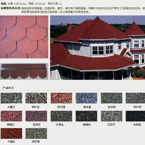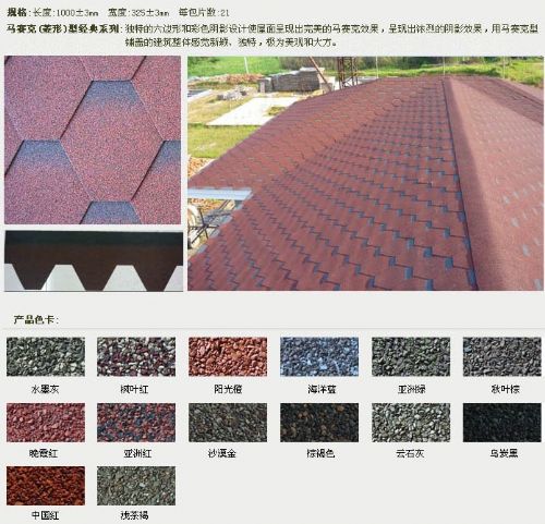 玻纤瓦表面的覆面材料所采用的是来自3M的高温烤瓷颗粒,美观大方,颗粒颜色丰富,经久不衰;瓦身采用的高品质沥青涂层具有优越的抗老化和抗高低温性能,具有全天候性,使玻纤瓦不仅能长时间抵挡严寒酷暑,也能解决其高温和低温状态下不能施工的缺陷;其从美国引进的JM公司的玻纤胎使我们的瓦片的耐候能力和防火性能得到*大优化,使产品更加坚韧耐用,也更加便于运输和施工。