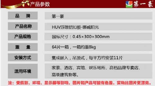 *一豪集成吊顶因其精美的造工工艺,*新的滚涂工艺,时尚绚丽的装修效果而备受家居装修、装饰装修公司、工程上的青睐,现在为大家带来的是这款家居安装的精美铝扣板 HUV浮雕铝扣板 厨房卫生间吊顶 挪威阳光 系列。5平方起包邮。每平方11片