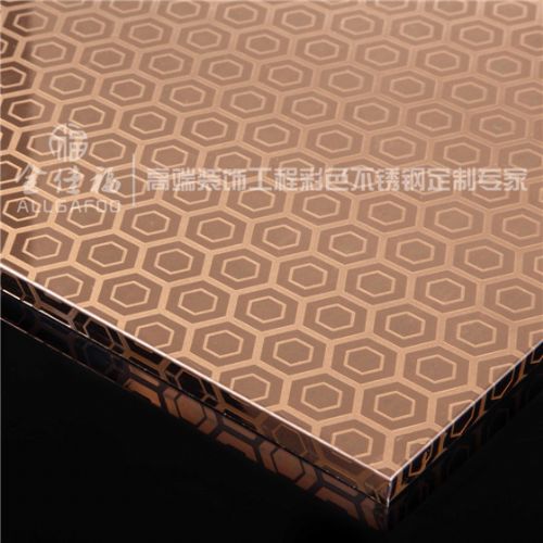 6、彩色不锈钢蚀刻板比彩色不锈钢板有立体的装饰效果,彩色不锈钢蚀刻所形成的花纹,使得板材更具有观赏性、多样性。装饰彰显高端,大气,上档次。