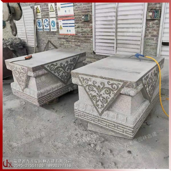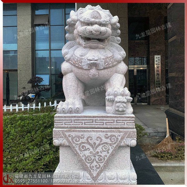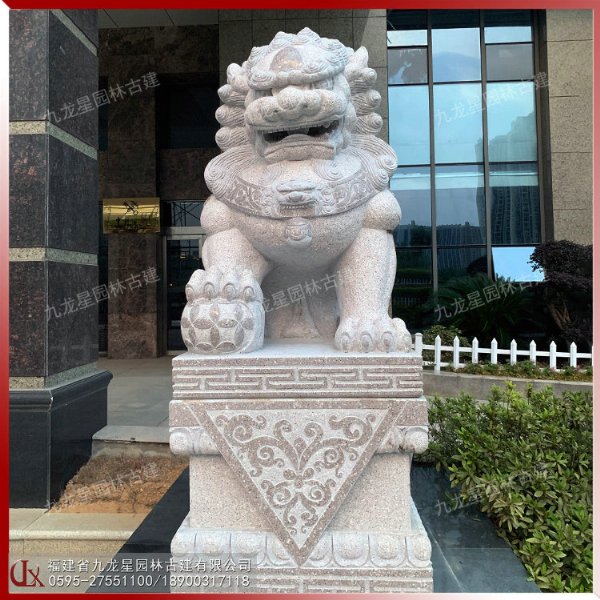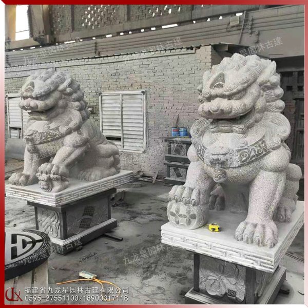 常见应用于建筑镇宅的石雕狮子造型是仿故宫北京狮子的形态。 本对石狮子是由九龙星园林古建加工的,采用花岗岩芝麻白石材雕刻而成,石材表面颗粒细腻,每个底座的四面分别雕刻四灵兽图案,石狮子整体形象威武霸气,摆放在宗词建筑门口有镇宅辟邪的寓意。 - 福建省九龙星园林古建有限公司