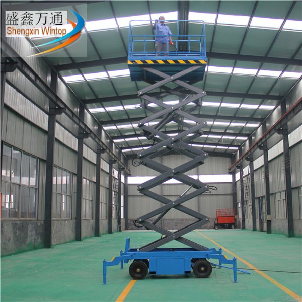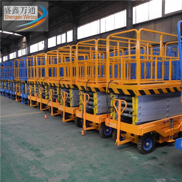 也叫移动式升降平台,根据使用要求,可配置其它附加装置,并可任意多项或组合,可加装柴油机、电瓶、手动泵以便在没有动力电的情况下使用,适用于工矿企业的高空重型设备检修维护,安装工程中高架设施的安装,车间内部设施的检修,广场的路灯安装维护;学校体育设施的检修;道路指示牌的安装更换。它的剪叉机械结构,使升降台起升有较高的稳定性,宽大的作业平台和较高的承载能力,使高空作业范围更大、并适合多人同时作业。