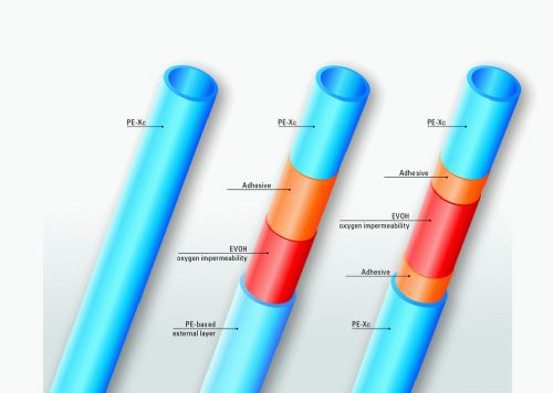 由五层组成:保护层(在PE基础上开发的一种化合物);胶黏剂;EVOH阻氧层;胶黏剂;pe-xc交联聚乙烯内层管