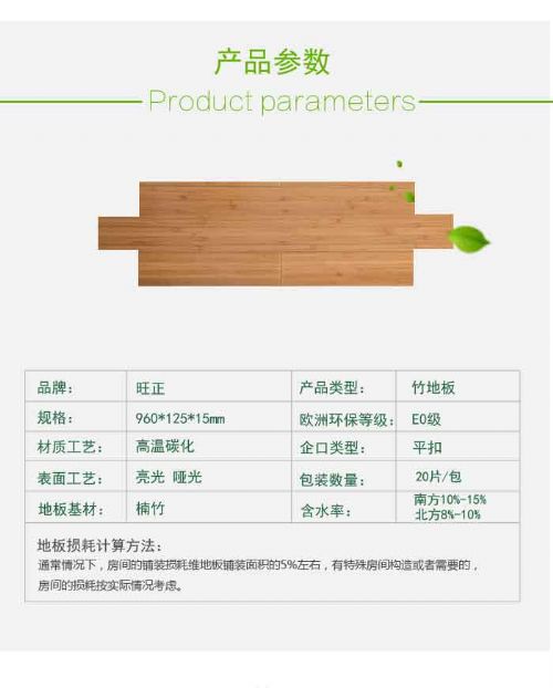 8)保修:超过20年;旺正竹地板的色泽,表面颜色基本一致,清新而具有活力,不论是本色还是碳化色,