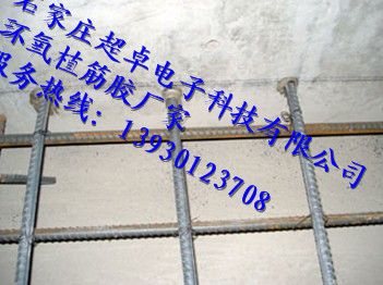 2.植筋锚固:将钢筋栽入部分表面和孔洞清理干净并干燥,在钢筋栽入部分涂胶并在孔洞内放入适量的胶后,将钢筋插入孔洞内即可