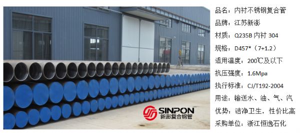 主营业务:内衬不锈钢复合管、内衬钛复合管、内衬铜复合管、内衬镍基合金复合管、内衬双相钢复合管、内衬不锈钢管件
