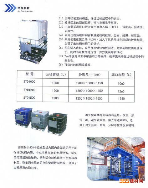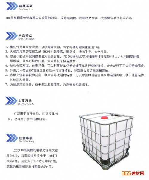 与圆桶相比,IBC集装桶可以节约35%的储存空间。它的尺寸依照ISO标准,以易于操作为原则,静态空桶可以堆高四层,并以任何常规方式运输。IBC集装桶可以多次重复使用,在灌装、储运和运输时体现出来的优势能明显地降低成本