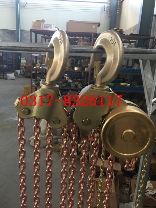 可防爆的倒链以铝青铜、铍青铜作为毛坯,手拉葫芦外壳采用H62铜合金材料。手拉葫芦受力摩擦部位包括构成手拉葫芦的起重轮、手链轮、墙板、挂钩、齿轮、齿轮轴采用铝青铜、铍青铜合金材料。