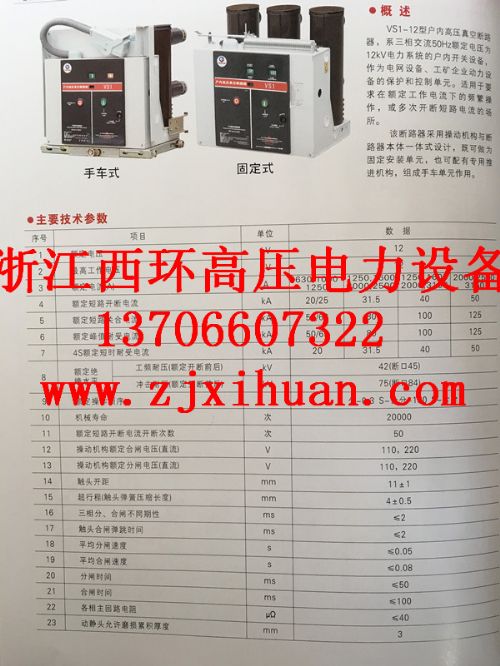 采用固定式结构,主要用于固定式开关柜中,亦可单独使用,对输配电线路进行控制和保护,由浙江西环高压电气设备有限公司制造生产。