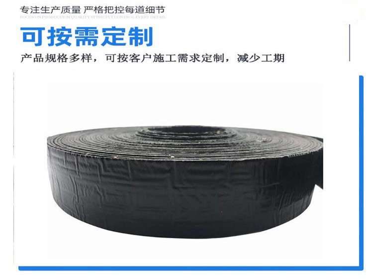 铺设贴缝带无需设备扩缝,是无损伤的裂缝处理技术;简单快捷,随时随地,粘贴完毕,即可通车,即时防止裂缝对道路产生的破坏;可随裂缝走向随意拐弯,能100%的沿着裂缝封缝,保证封缝质量;适应温差大的区域,在路面高温时,本产品不会被挤出或被车轮碾走而污染路面。贴缝带常规宽度有15公分、8公分、5公分、3公分,可根据缝宽及抗裂需要现场剪切或拼接,也可按要求制做。