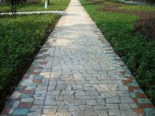 是通过彩色硬化剂经特殊处理后渗透进混凝土表层,在原有混凝土的表面形成坚固致密的新面层。彩色脱模粉是用于压模过程中保证混凝土面层完整、清晰的纹理,同时又提供了第二种颜色并与彩色硬化剂的基本颜色组合、从而创造出天然逼真的效果。地坪保护剂的滚涂不仅起到保护混凝土的作用,而且使混凝土的颜色与图案更加鲜艳夺目。