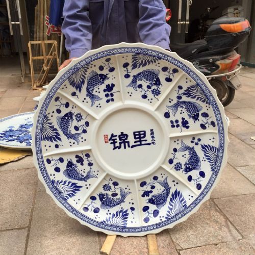 常规规格在1米-1.8米,画面有虫鱼鸟兽,梅兰竹菊,莲花,植物,楼阁,牡丹,龙纹,庭院国画等。由于大瓷盘直径太大,通过模具制作是根本不可行的。因此制作这款陶瓷大瓷盘从泥胚的制作开始都是人工手工拉坯、修坯,待泥坯干燥后,用特殊的陶瓷颜料将精选陶瓷厂的画面手绘到瓷盘上面。大瓷盘的烧制是经过1300摄制度的高温烧制而成,这一特性是的我们的陶瓷大瓷盘画面可**保存、**退染色。
