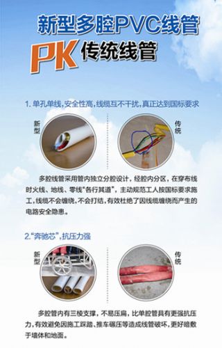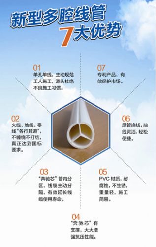 PVC线管采用管内分设计经挤塑一体成型,穿布线时规范了线缆在导管内的走向,实现单孔单线,绝缘隔层对线缆起到双重保护,避免短路,免除后顾之忧。线管内线缆胶皮若有损坏,线缆的近距离缠绕在一起,容易引发漏电,产生短路,轻则连电,重则损坏家中电器;管让线缆中的火线、零线、地线“各行其道”,不会发生短路。