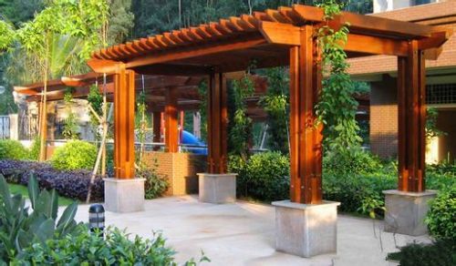 ②片式花架。片版嵌固于单向梁柱上,两边或一面悬挑,形体轻盈活泼。