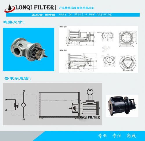 安装在液压系统的油箱旁,并设有手动自封阀和滤芯堵塞发讯器,安装的时候必须浸入液面以下,出油口水平或向下倾斜,当滤芯被污物堵塞时,到出油口真空度为0.018MPa时,发讯器发出信号,应及时清洗或更换滤芯,在更换滤芯时,应关闭自封阀,使油箱中的油液不会流出,以防泵口出现吸空现象。