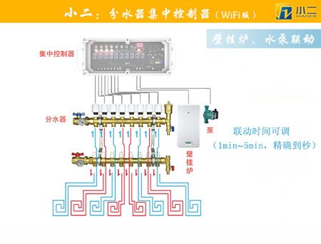 3. 联动1路壁挂炉和1路增压泵。任何一路分水器打开后,集中控制器会联动壁挂炉打开,同时增压泵也会打开。