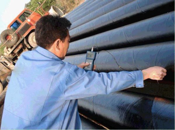 5、检漏和补漏。防腐层缠后静置自干,至少36h内保持不淋雨、不泡水。待防腐层实干后,用电火花检漏仪,对0.4mm防腐层用2.5kV,对0.6mm防腐层用3.0kV,对0.8mm防腐层用5.0kV检查因涂胶不均匀或漏涂而形成的少量针孔,并对出现针孔处用粉笔圈出记号并尽快涂定型胶补漏。