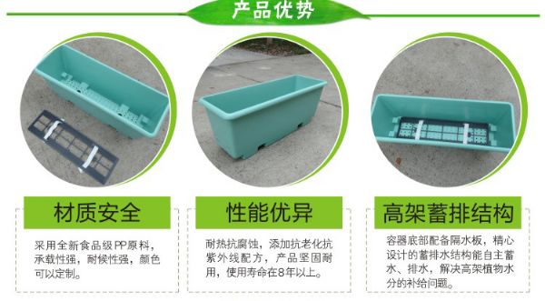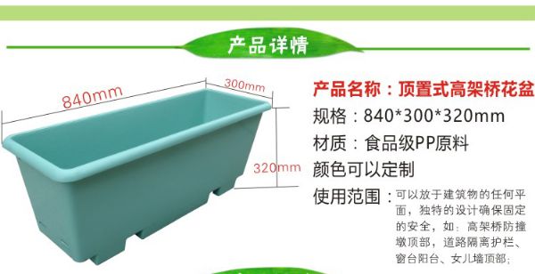 产品特点和用途:此产品可以用于高架桥人行天桥绿化,也可以悬挂于窗台外侧、阳台、屋顶、墙壁、护栏, 在护栏的一侧或两侧使用,要支撑钢结构。产品采用高度耐老化配方,抗紫外线能力强,同时具备储水和排水功能,可以雨水再利用,也使排出去的水是清晰的。土层深厚适合小灌木生长。