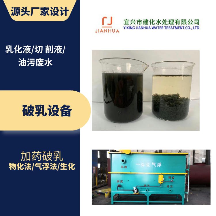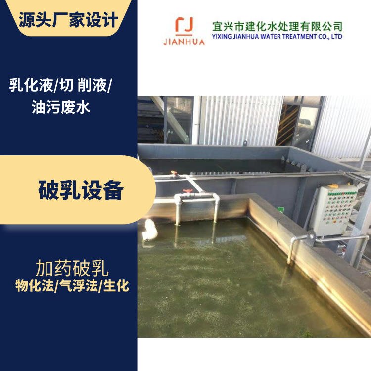 乳化液废水自流进入调节池,调节池内设置液位控制器进行液位调节控制,在污水泵提升进入破乳槽和混凝反应槽,投加破乳剂和助凝剂经机械搅拌反应后进入气浮反应池,实行化学法快速破乳反应及气浮浮选分离。这种处理技术是*于破坏经过初级分离后的油水乳浊液并把破乳后的油从水箱中分离出来,分离出来的废油由气浮顶部的刮渣机刮出池外进入废油池。其中破乳方法采用化学法,破乳剂为氯化钙。