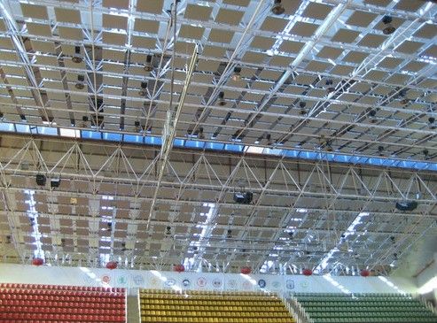 体育馆空间吸声体由骨架、护面层和吸声填料构成。材料的选择应视空间吸声体的大小、刚度和装修要求而定。骨架可采用木材、角钢、薄壁型钢等。护面层可采用塑料窗纱、塑料网、钢丝网和各种板材(如薄钢板、铝板、塑料板等)的穿孔板,其板厚可取0.5~1.0毫米,孔径可取4~8毫米,穿孔率应大于20%。吸声填料通常采用超细玻璃棉外包玻璃纤维布,其填充密度可取25~30千克/米3,厚度应根据声源频谱特性在5~10厘米范围内选定。