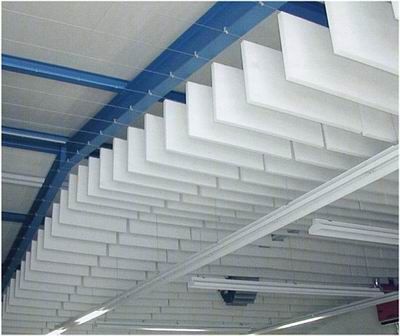 空间吸声体与室内表面上的吸声材料相比,在同样投影面积下,空间吸声体具有较高的吸声效率。这是由于空间吸声体具有更大的有效吸声面积(包括空间吸声体的上顶面、下底面和侧面);另外,由于声波在吸声体的上顶面和建筑物顶面之间多次反射,从而被多次吸收,使吸声量增加,提高了吸声效率。通常以中、高频段吸声效率的提高*为显著。