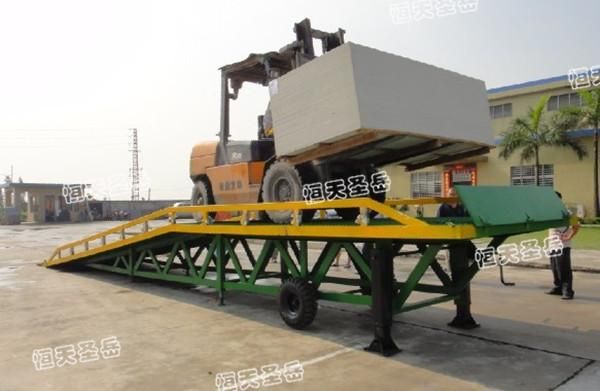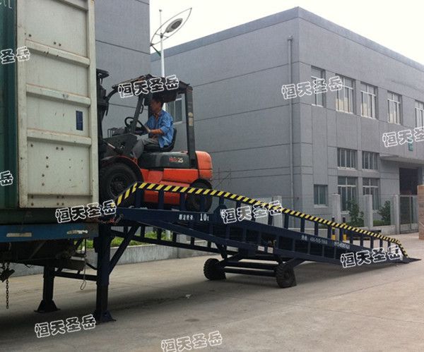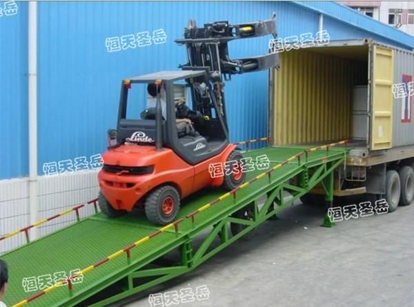 移动式液压登车桥是与叉车配合使用的货物装卸辅助设备,可根据汽车车厢的高低调节高度,叉车可以直接通过..
