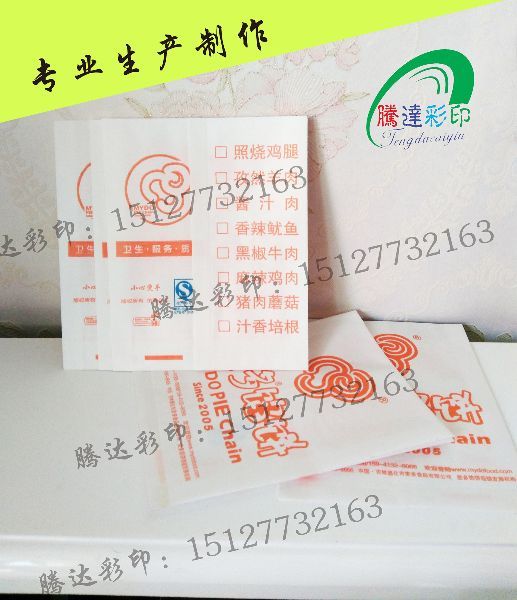 本厂主营:各种食品防油纸袋,一次性牛皮纸袋,土家酱香饼袋,肉夹馍袋、淋膜纸袋,里脊扒饼袋、麦多馅饼袋,地瓜坊袋 奥尔良鸡脖鸡柳袋 台湾无骨鸡柳袋,鼎香坊袋,爆米花袋,手抓饼袋,煎饼袋,汉堡包袋,,汉堡袋,公婆饼袋,馋嘴烧饼袋,鸡柳袋,栗子袋,土耳其烤肉袋,红薯袋,羊肉串袋,武大郎烧饼袋,冰糖葫芦袋 、馅饼袋等各种防油纸袋生产印刷。