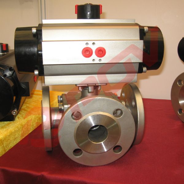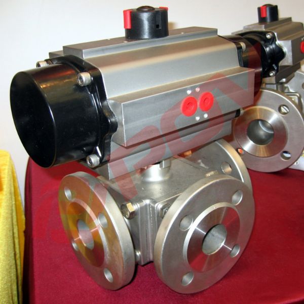 由3段式气动执行器和三通球阀组成,利用2个电磁阀来控制阀门位置。气动执行器可以实现0度,90度,180度三个位置